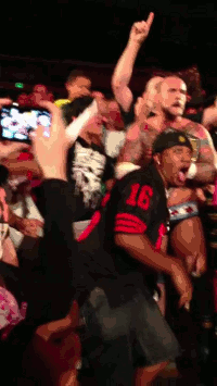 Punk is in the audience and the guy seems to be putting on his sun glasses and Punk just turns around and gives him a two piece and a biscuit.