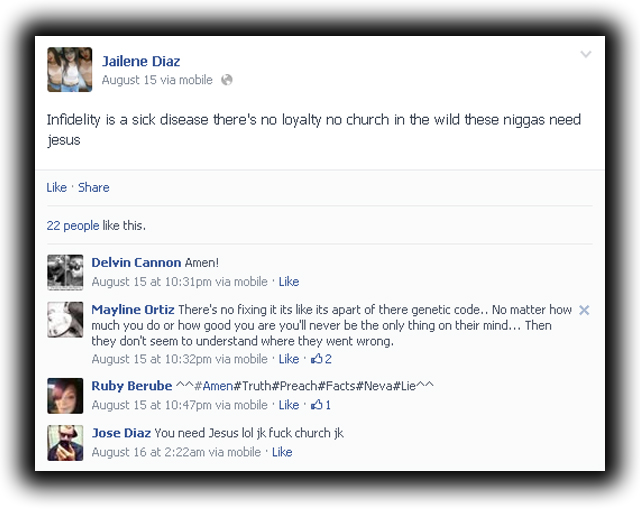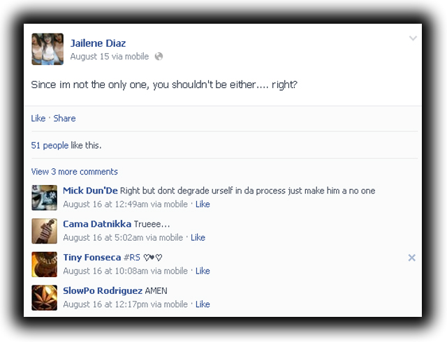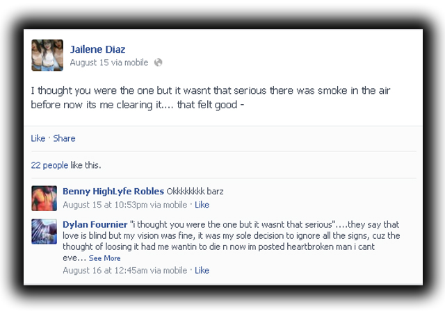 Finally, this may mean nothing, but it seems that Diaz-Ramos recently has some heartbreak in her life. Several Facebook posts suggest that she is currently recovering from being scorned by her lover.