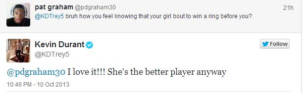 The question was posed to Durant on Twitter about Wright now having the most rings in the family. Durant, who is chasing his first ring agreed and even paid his sweetheart the ultimate compliment.
