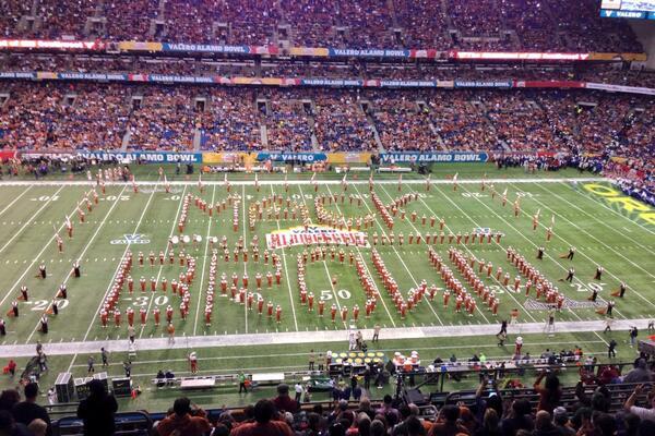 Tonight’s Alamo Bowl is Mack Brown’s final game with Texas so they have been doing some nice things for him throughout the game. The band actually spelled out his name during their halftime performance tonight, which was a nice gesture for the outgoing coach.