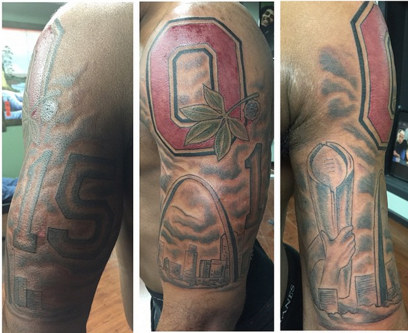 The Likely 2015 Heisman favorite got a new tattoo with the Buckeyes logo, his number 15, the skyline of St. Louis and the National Championship trophy.