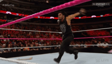 The Wyatts all begin beating down on Ambrose when SUDDENLY A FLYING ROMAN REIGNS APPEARS.
