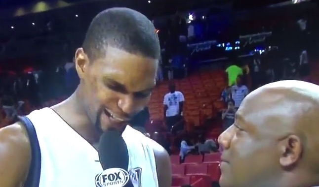 In all seriousness, if there is one thing I miss about the champion Heat teams, it’s the weird post game interviews. After scoring a cool 29 points in the 116-109 victory over the Trailblazers in Miami, Bosh gave a sweet message in an extraordinarily weird way.