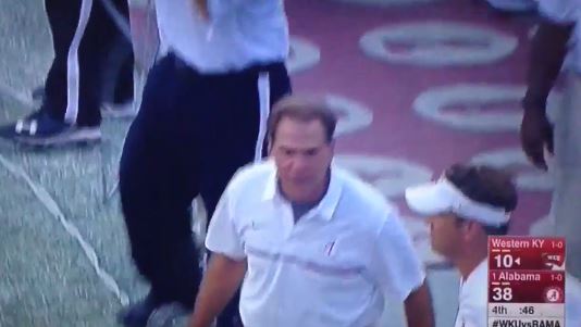 The Alabama Crimson Tide are rolling Utah State 38-10 in Tuscaloosa, but that didn’t stop Nick Saban from letting Lane Kiffin know that things will not change, regardless if he just got $500K raise.