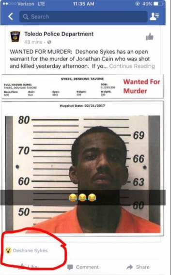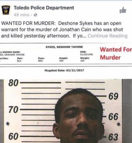 A man wanted for murder by the Toledo Police Department replied to the Facebook post with a shocked emoji. Yes, you read that correctly. Deshone Sykes has an open warrant for the murder of Jonathan Cain.