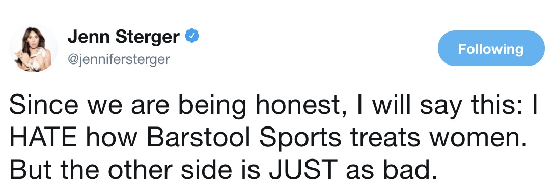 If you believe her story, it shows a couple of things. One that white males can pretty much do whatever they want and will continue to fail up. That ESPN is being hypocritical now by saying they don’t want to be associated with Barstool.