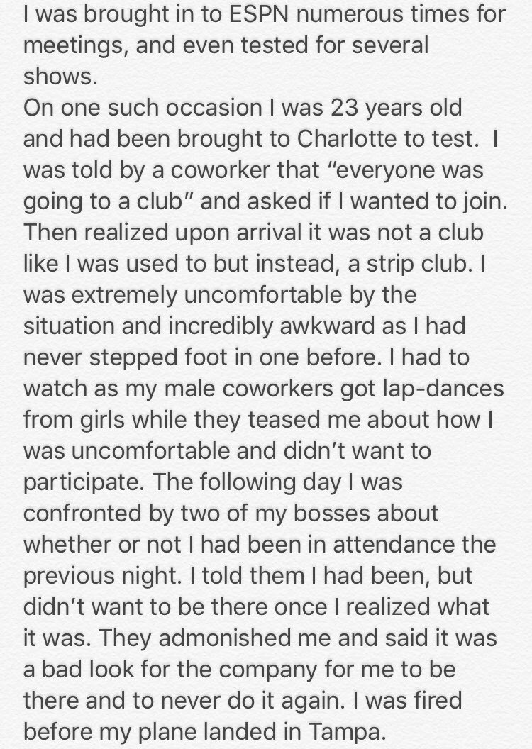 She posted on Twitter a story about meetings with ESPN and the sexual harassment she faced. The interesting thing about the stories are the executives and talent at ESPN even after the harassment kept moving up the food chain.