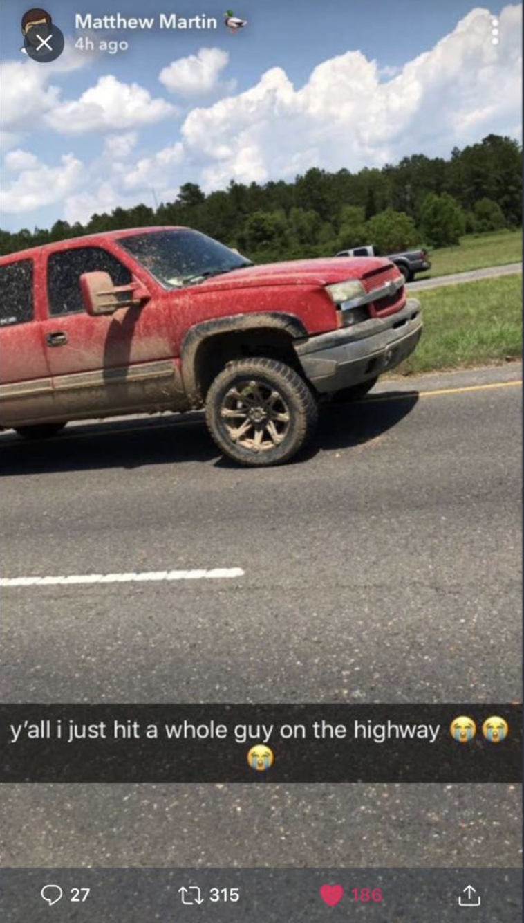 Washington Post reports that Sherell Lewis Jr was helping another driver clear debris from the road when he was struck by a pickup truck driven by Matthew Martin in May. Lewis was pronounced dead at an area hospital. Following the incident, Martin posted the accident on his Snapchat account and told a friend that he hit, “some nigger.”