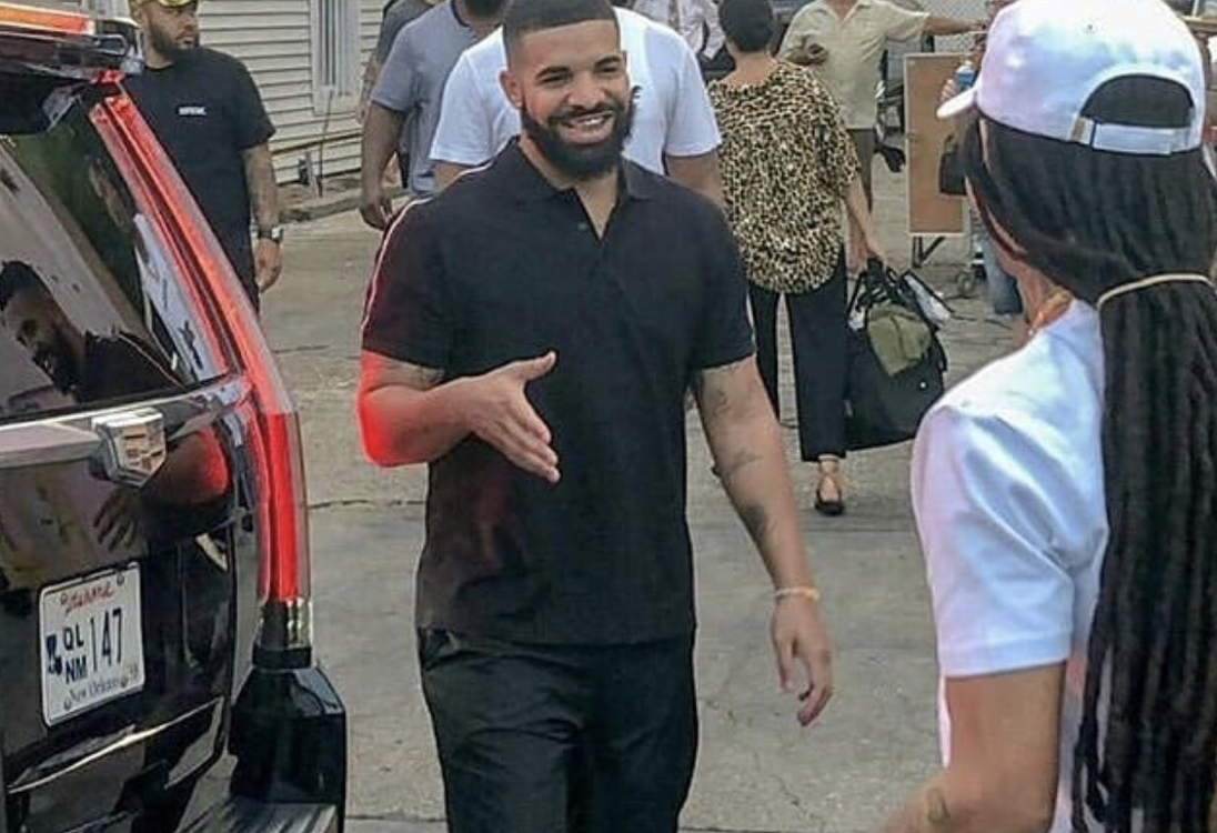 A picture surfaced on social media on Wednesday of Drake greeting another man while his beard appeared to be falling off, wig-style, on the left side of his face.