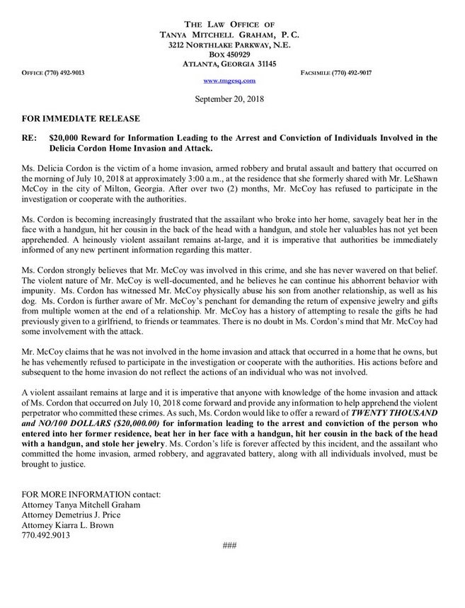 Today she released a statement saying that McCoy sent the goon and abuses his son and dog. She is also offering a $20k reward for anyone willing to snitch on McCoy.