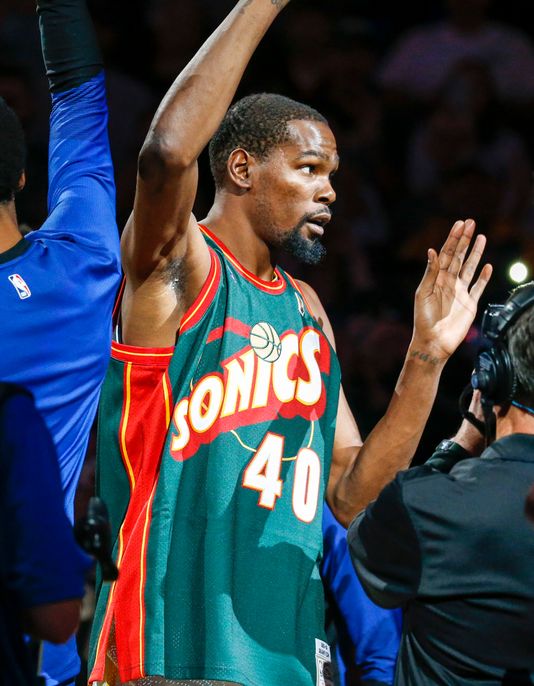 The sell out crowd at KeyArena, who gave Kevin Durant a round of applause every move he made in warm-ups. But the former Longhorn set the tone for the night by wearing a Shawn Kemp jersey with green and gold sneakers smiling. The top blew off the arena as Kevin Durant’s euphoric feeling of basketball in Seattle resonated with him in that moment.