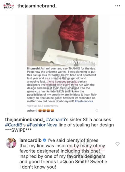 One critic of the clothing line is Ashanti’s little sister Shia Douglas. She took to Instagram to claim that Fashion Nova and Cardi copied some of her designs. Douglas owns the clothing line Dymes Only.
