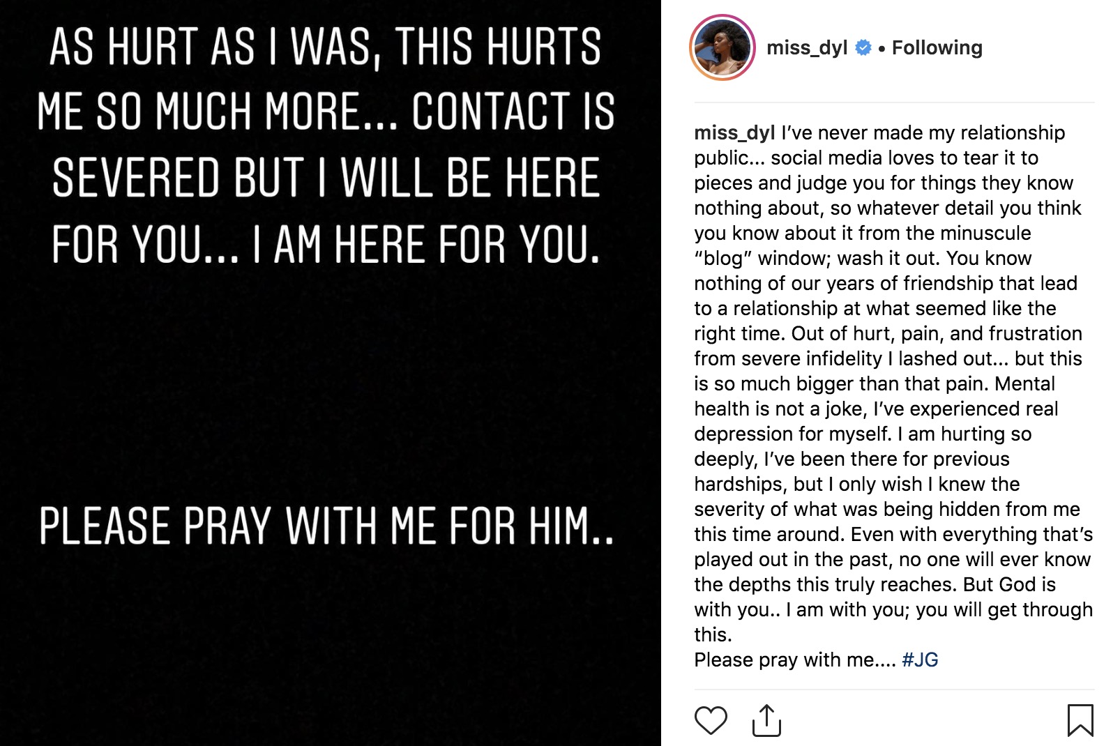 She decided to address the situation straight up in an IG post, so people wouldn’t speculate anymore. She confirms that she and Gordon were in a relationship, there was infidelity and she no one longer speaks to Gordon.