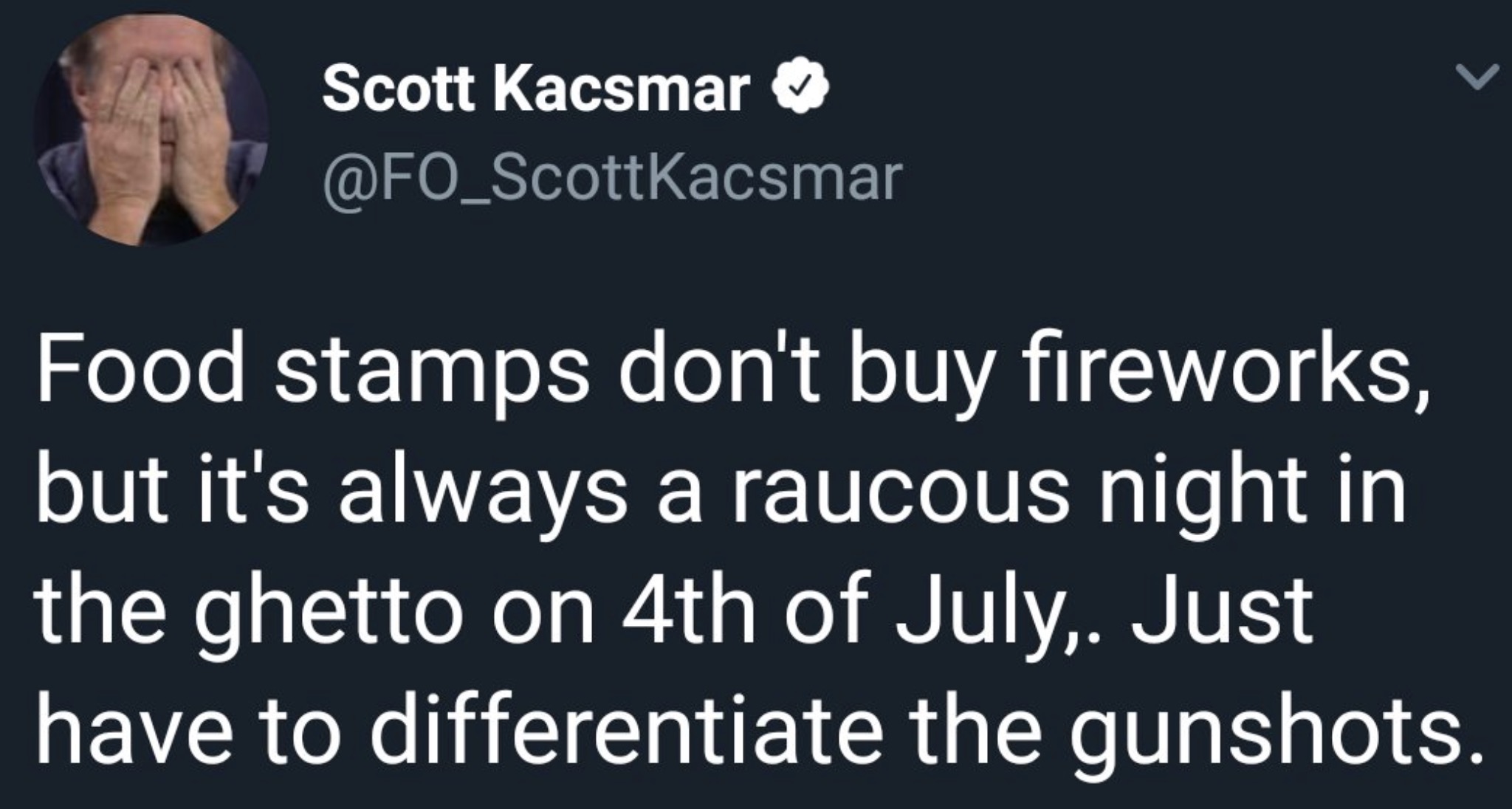 The fact that Scott Kacsmar who is the Football Outsiders Asst Editor didn’t really apologize, but instead said when he spoke of the “hood” he was talking about his own experience, and while we might see it as racist, he isn’t racist.