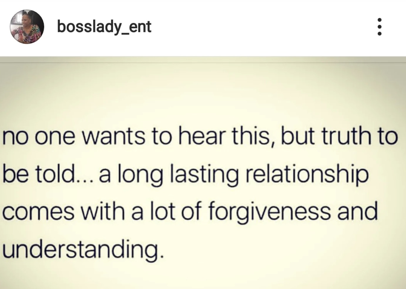 She posted a meme which stated, “a long lasting relationship comes with a lot of forgiveness and understanding.”