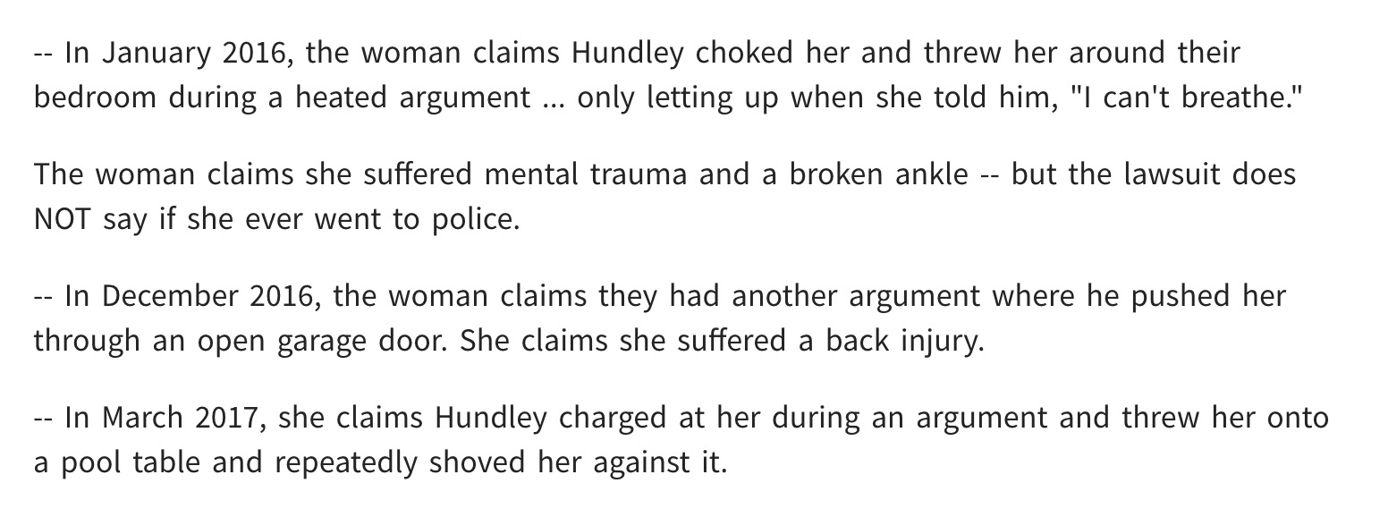 It doesn’t appear Hundley’s ex-wife went to the police with any of her claims but she has decided to sue him over everything he put her through during their four-year marriage.