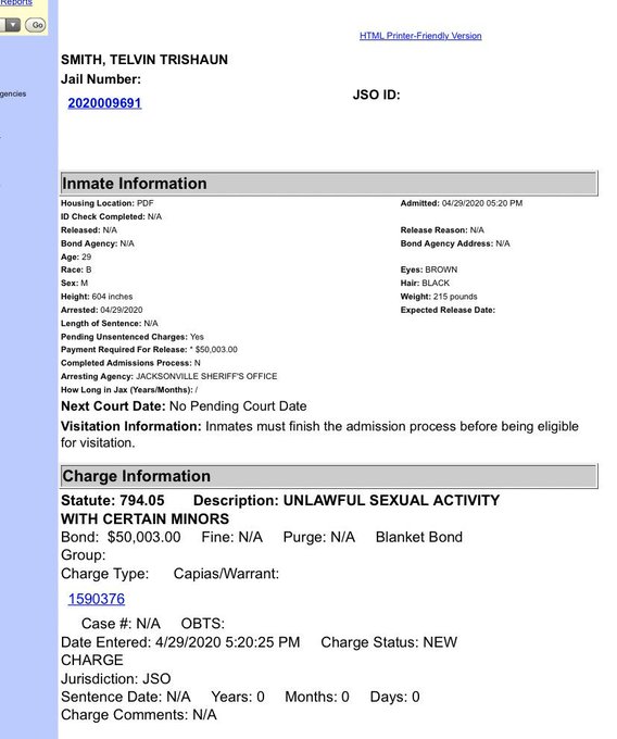 Duval County jail records show he was booked at 5:20 p.m. and arrested on the charge of unlawful sexual activity with certain minors. He was held on a $50,000 bond.