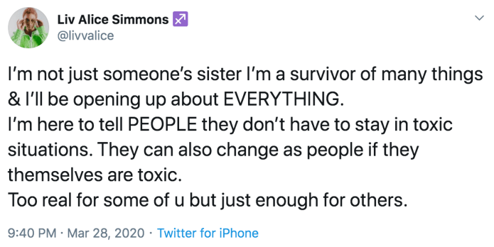 Ben Simmons’ sister Liv Alice Simmons recently took to twitter to discuss some abuse she’s been through. Liv apparently hasn’t gotten the support from her family but has found plenty of support on social media after sharing her story, which is long and crazy.