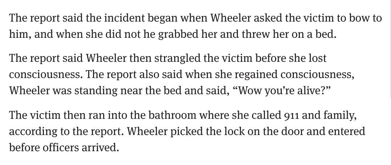 According to the report, when officers arrived they could hear screaming from inside the apartment, and after forcing their way in they heard more screaming from a bathroom. They forced their way in to the bathroom and found the victim and Wheeler. He was standing beside her, the report said.
