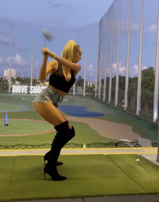 Instagram model Bri Teresi got some work in on her golf swing this week, and made sure she put on quite the show when she showed up to Top Golf sporting booty shorts, a very low-cut top exposing her boobs, and thigh-high boots.
