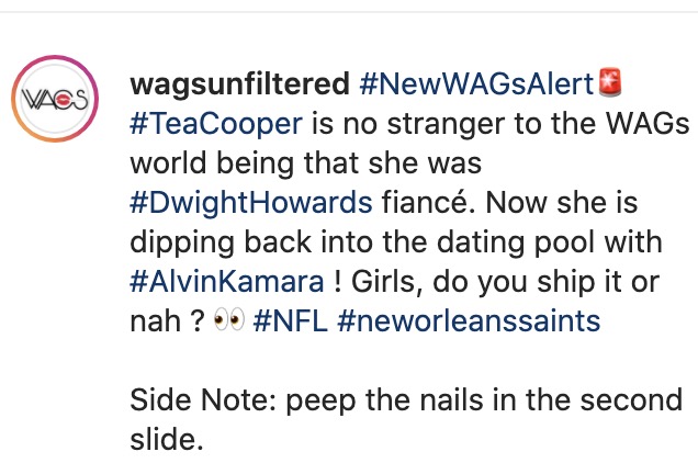 According to Wags, Cooper was spotted getting cozied up with New Orleans Saints running back Alvin Kamara.