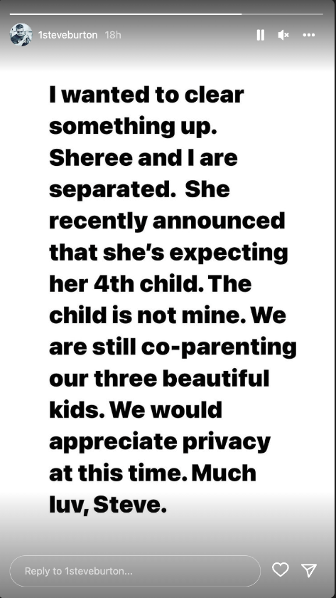 “I wanted to clear something up. Sheree and I are separated,” Burton’s post began. “She recently announced that she’s expecting her 4th child. The child is not mine.”