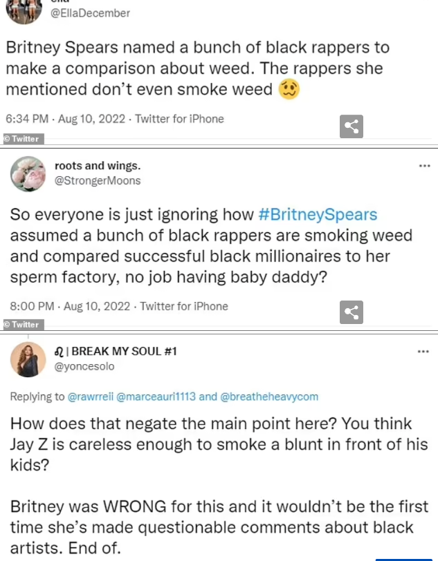 ‘Britney Spears named a bunch of black rappers to make a comparison about weed,’ another pointed out.