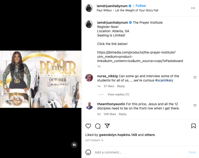 “1,499 to pray? This is a joke.. what could she teach me about prayer that the Bible hasn’t already has? I’ll wait…..3.2.1. Go..” “Please take this down. This is truly shameful and one of the reasons people have lost faith in the church…BECAUSE OF GREED.”