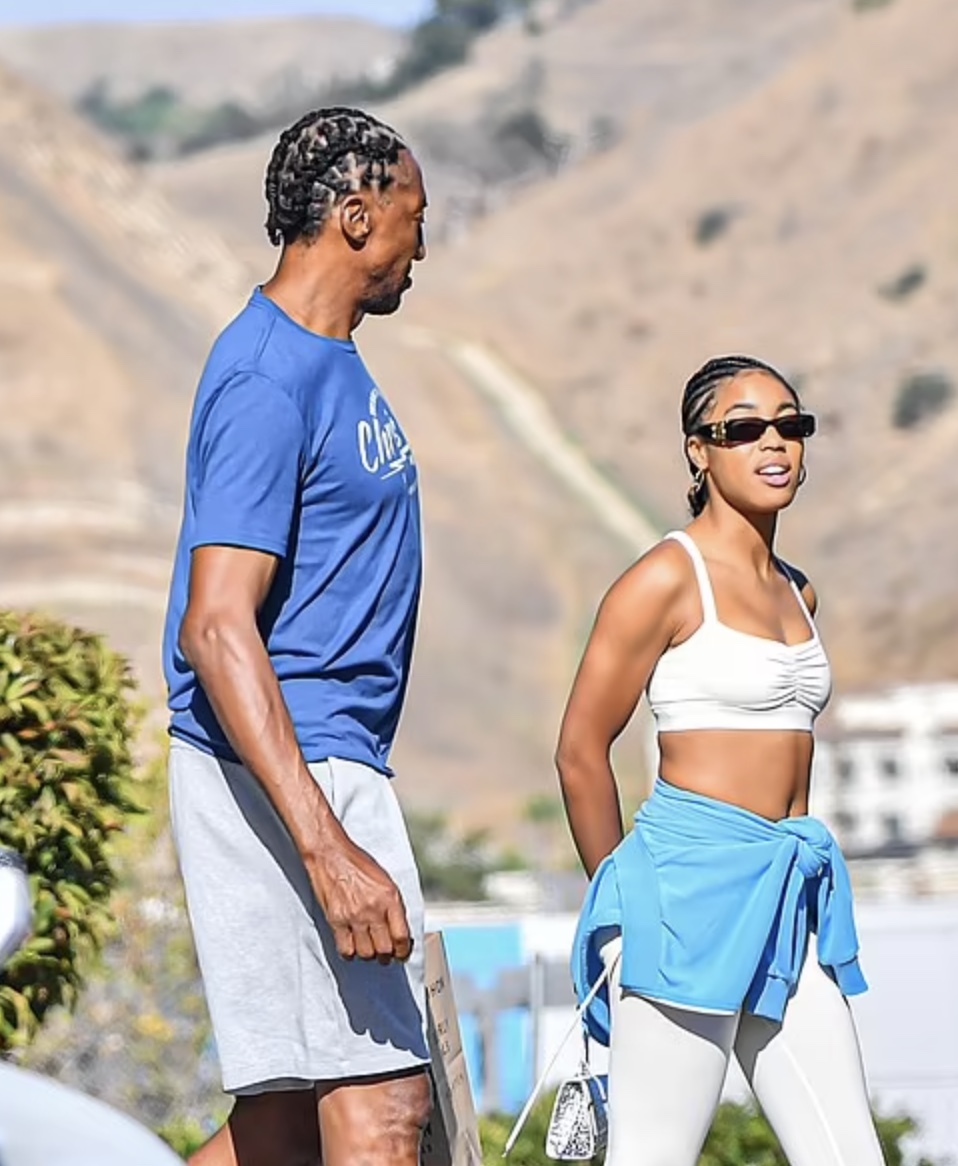 The seven-time NBA All-Star was seen with a woman clad in a white athletic wear ensemble with white sneakers and a light blue sweater tied around her waist. She wore sunglasses and hoop earrings.