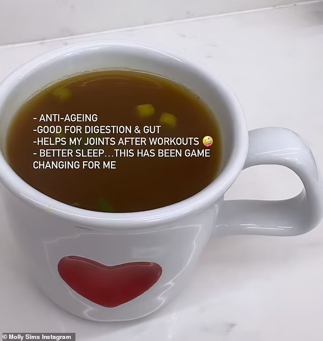 Over the photo of the mug of broth she wrote: ‘Anti-ageing, good for digestions and gut, helps my joints after workouts, better sleep… this has been game changing for me.’