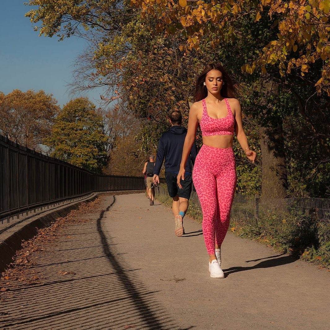 Yanet looked gorgeous in a pink leopard two-piece with a spandex top and matching high-waisted pants. She paired the wild animal print look with white sneakers that featured pink designs on the tongue of the shoe.