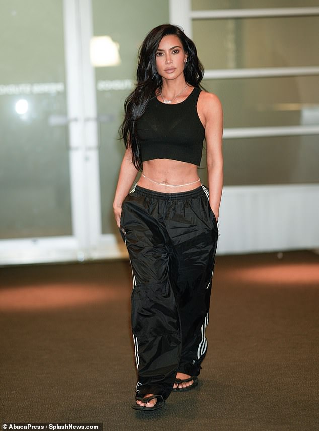 The mother of four showcased her svelte waist in a short-sleeved top with Adidas pants slung low.