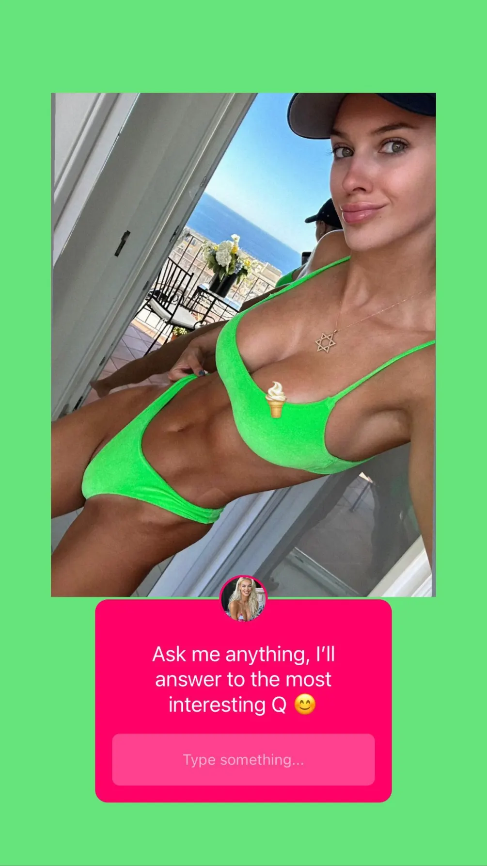 Veronika took to Instagram on Monday and delighted fans with a lime green two-piece in her Instagram story while asking fans to send her questions.Â