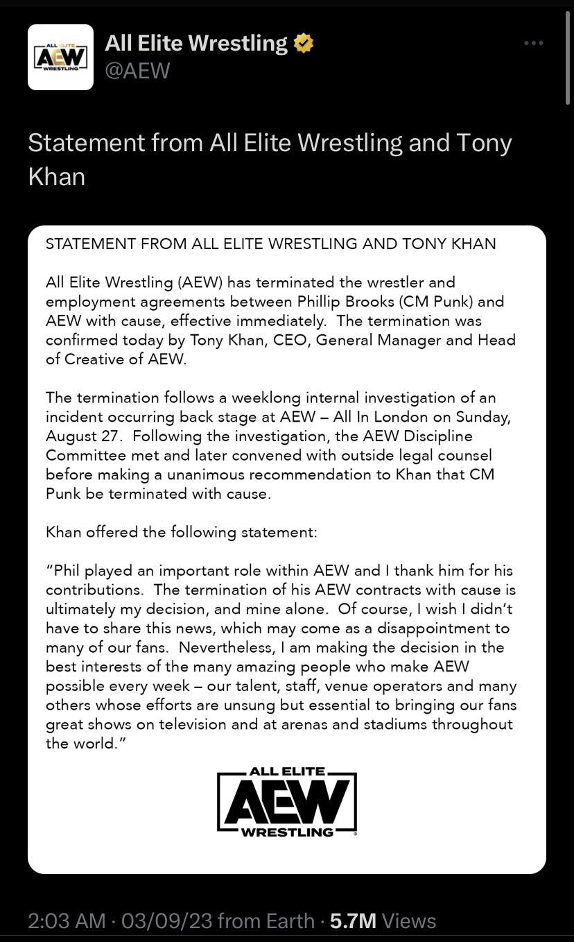 “All Elite Wrestling (AEW) has terminated the wrestler and employment agreements between Phillip Brooks (CM Punk) and AEW with cause, effective immediately. The termination was confirmed today by Tony Khan, CEO, General Manager, and Head of Creative of AEW.”