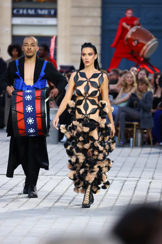At Vogue World: Paris, Katy created quite a stir by lighting up the runway and entrance at Place Vendôme like fireworks. Wearing an archival Noir Kei Ninomiya dress, the pop sensation walked confidently into the Parisian plaza, with drummers trailing behind her.