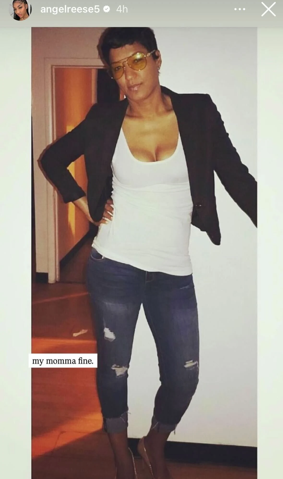 The Chicago Sky forward posted some pictures of her mother, Angel Webb Reese, on her Instagram Story. In one image, which seems to be from the past, Webb is dressed in a black coat, tan heels, and denim jeans and a white shirt.
