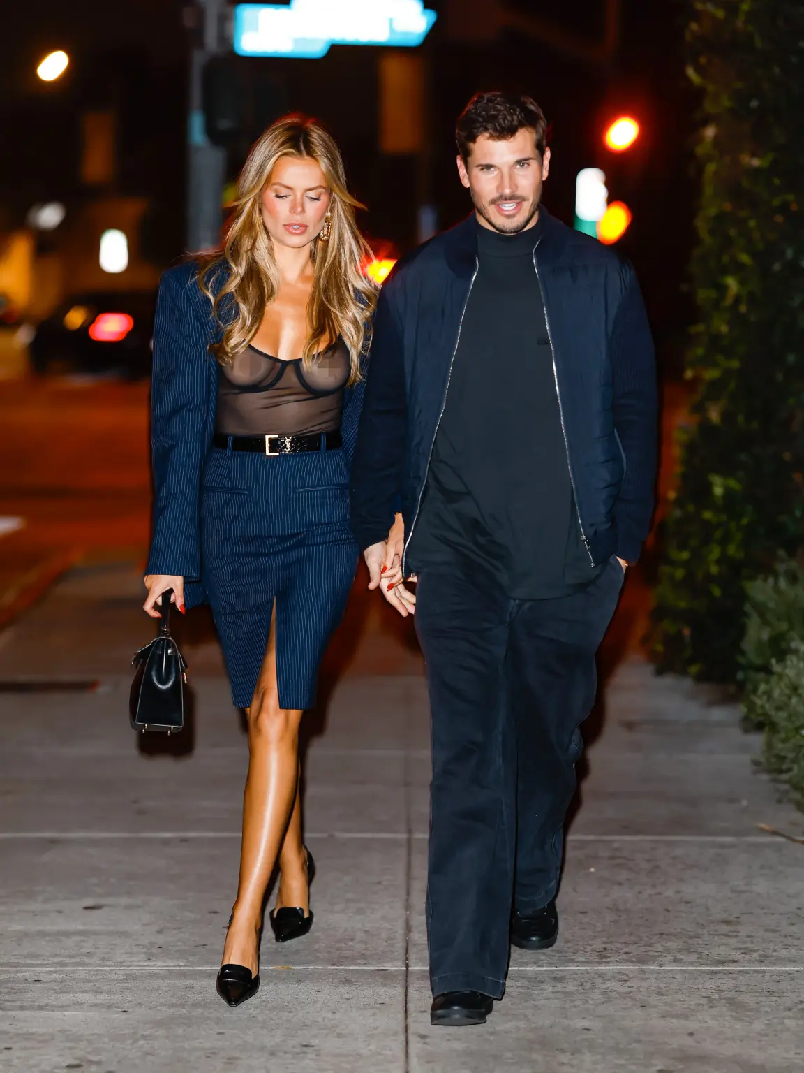 Brooks Nader wears a transparent top and no bra for a seductive date night.