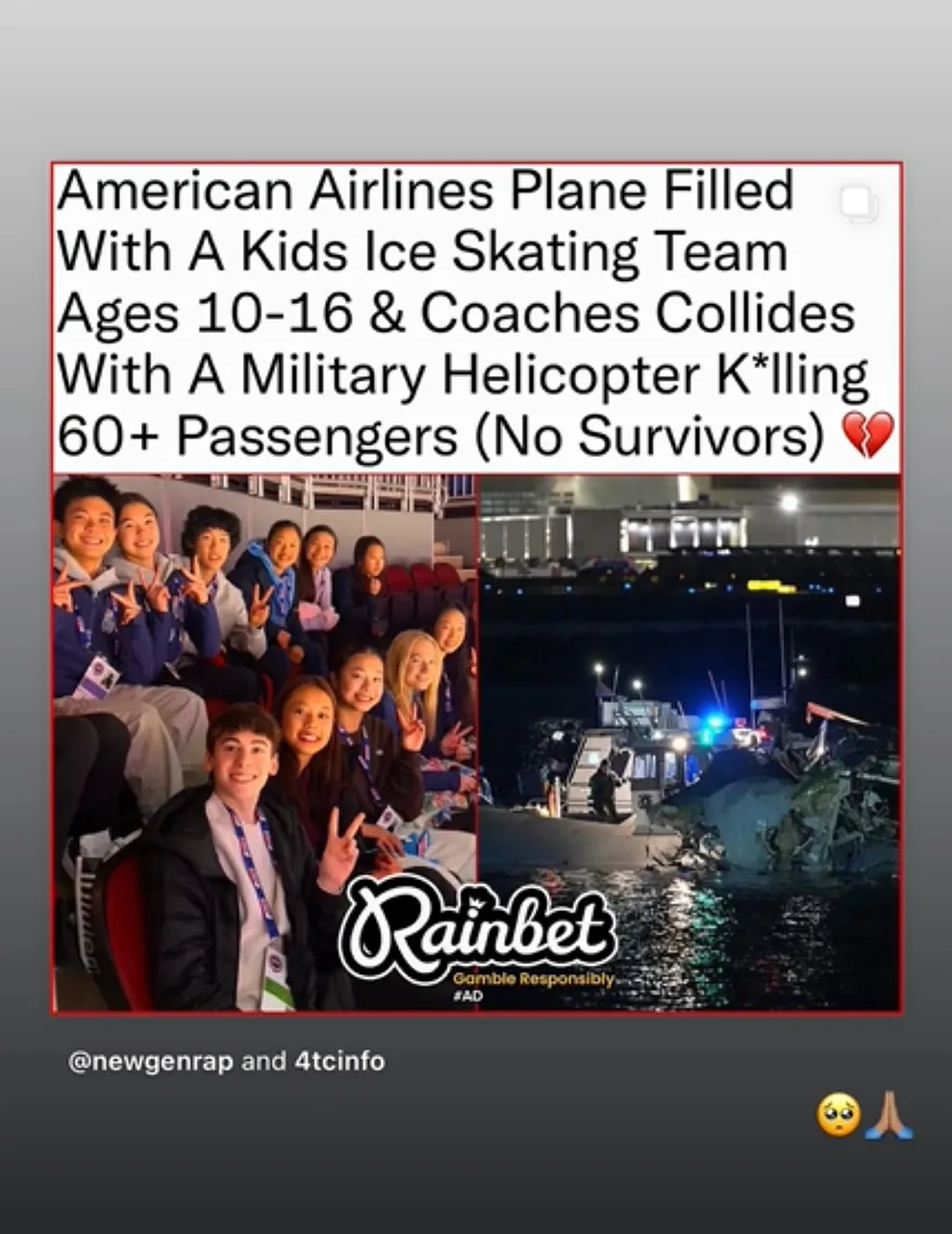 The horrific mid-air crash above Washington, D.C., which killed 67 people, including several young figure skaters, their coaches, and their families, has left the sports community in shock. There were no survivors of the collision between an American Airlines airplane and a U.S. Army Black Hawk chopper.