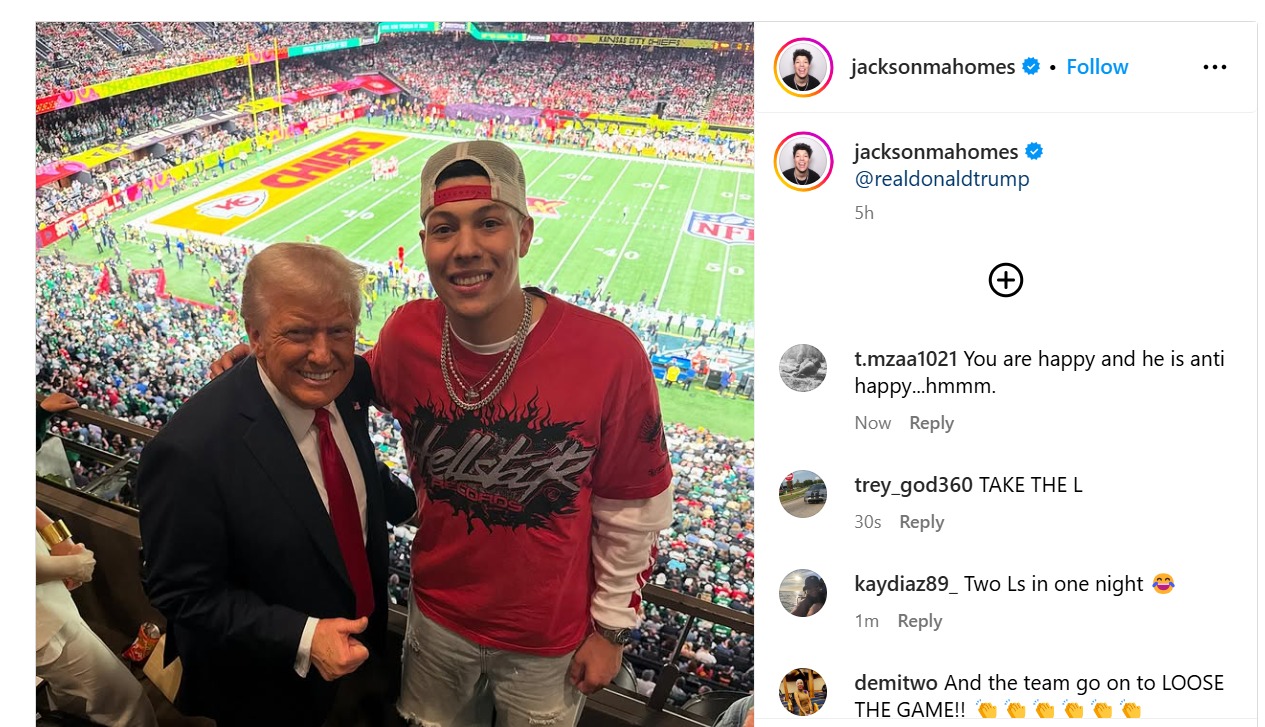Jackson Mahomes and Trump posed for a photo in the suites at the Superdome. When he took in the competition, others responded with phrases like “God bless America” and “America is back.”
