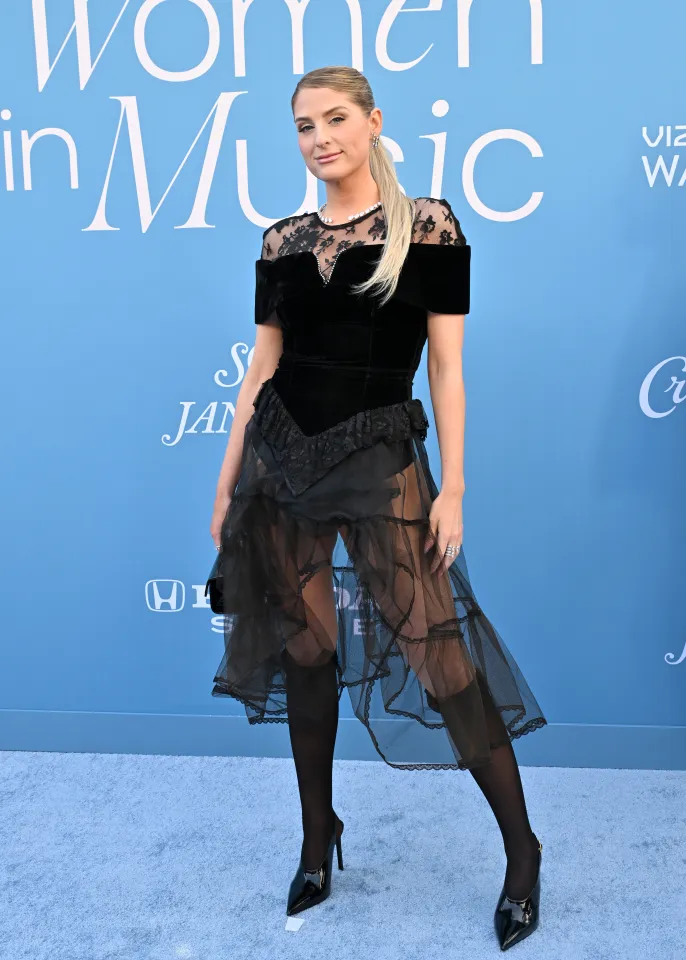 With its figure-hugging velvet bodysuit, see-through black skirt, knee-high tights, and kitten heels, the ensemble was quite striking on the baby blue carpet.