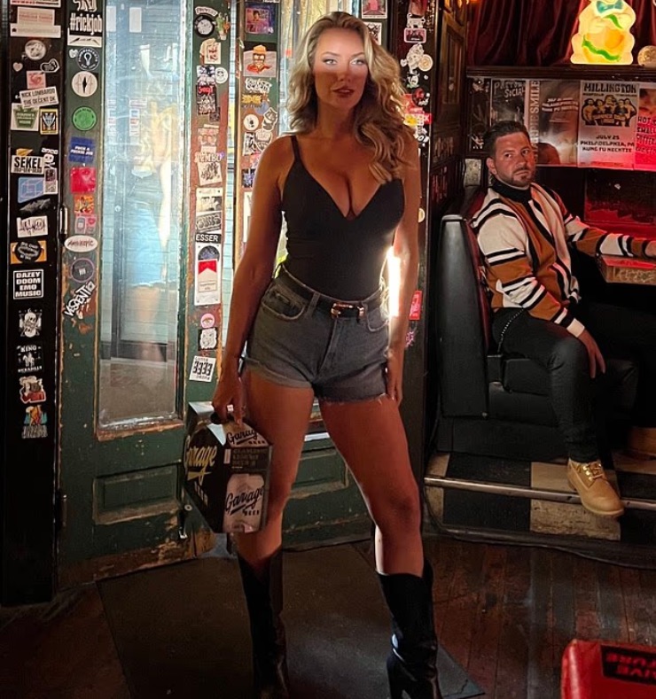 In the photograph, she is dressed in denim shorts and a low-cut black top, showcasing some cleavage, paired with black leather boots and with her hair down. This image was shared after Paige made an appearance on the red carpet for the premiere of Happy Gilmore 2 on Monday.