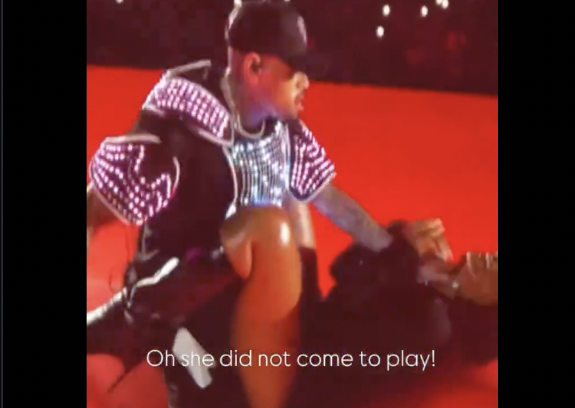 The two engaged in a passionate display for about half a minute, which sent the audience into a frenzy. As the song concluded, Brown leaned in for a kiss, but the lights went down just before anyone could confirm if they actually kissed.