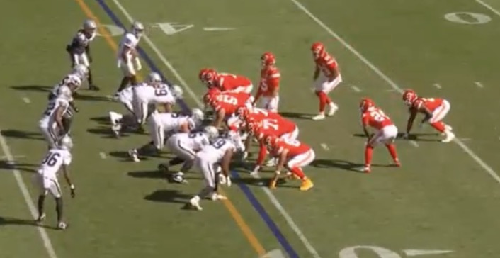 He then crouches again … and actually runs a play — a run up the middle by Kareem Hunt for the first down!