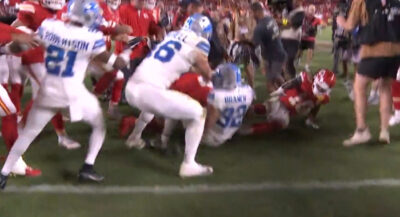 Smith-Schuster retaliated, trying to get at Branch while Mahomes pulled the Lions DB away; then everyone got involved, and Mahomes ended up at the bottom of a pile.