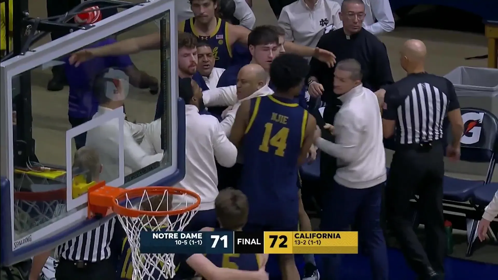 Micah Shrewsberry, the coach of Notre Dame, had to be restrained after becoming enraged at a call made by the referees during their defeat against California.
