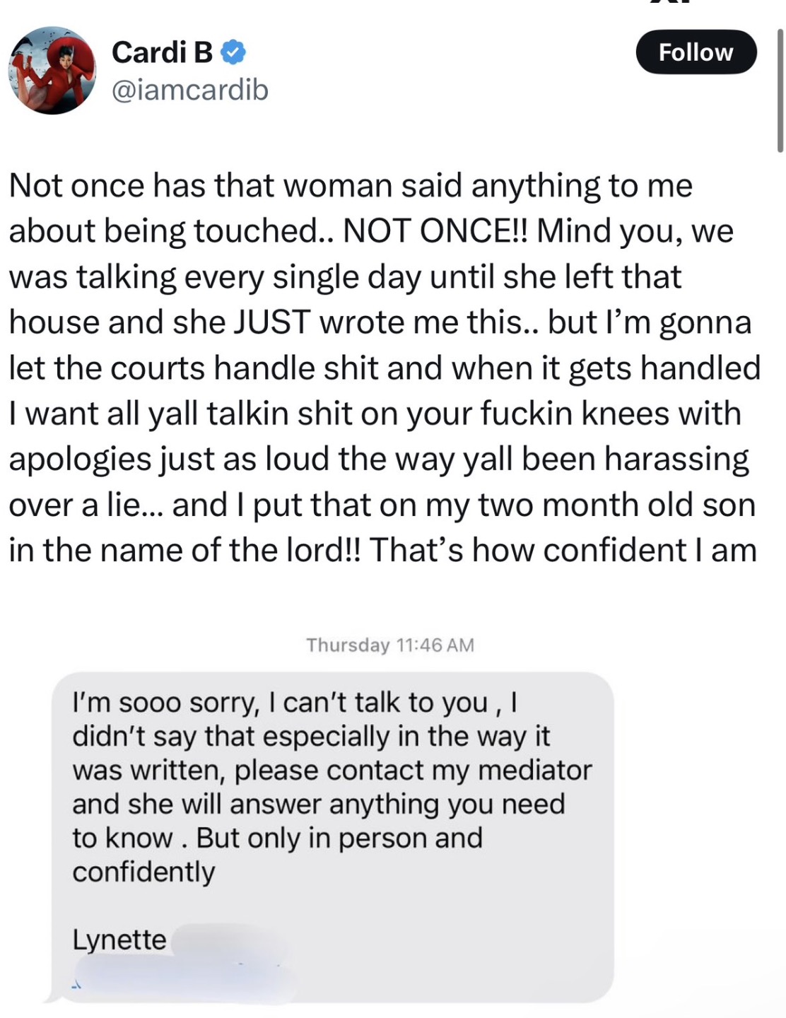 “I’m gonna let the courts handle s***,” Cardi B wrote, “and when it gets handled I want all yall talkin s*** on your f***in knees with apologies just as loud the way yall been harassing over a lie.”