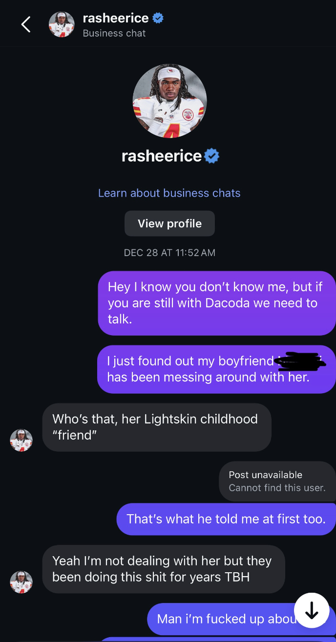Leaked direct messages purportedly show an unidentified woman contacting Kansas City Chiefs wide receiver Rashee Rice in late December to warn him that his then-girlfriend, Dacoda Nichole Jones, was allegedly involved in an affair with the woman’s boyfriend, described as Nichole’s “lightskin childhood friend.” Rice responded by indicating he was already aware of the infidelity, stating it had been ongoing for years and that he was no longer involved with her.