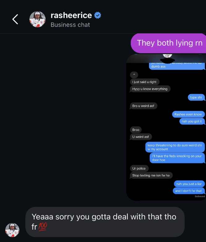“Hey I know you don’t know me, but if you are still with Dacoda we need to talk. I just found out my boyfriend [redacted] has been messing around with her.” Rice replied, “Who’s that, her Lightskin childhood ‘Friend,'” and after confirmation from the woman, added, “Yeah I’m not dealing with her but they been doing this shit for years TBH.”
