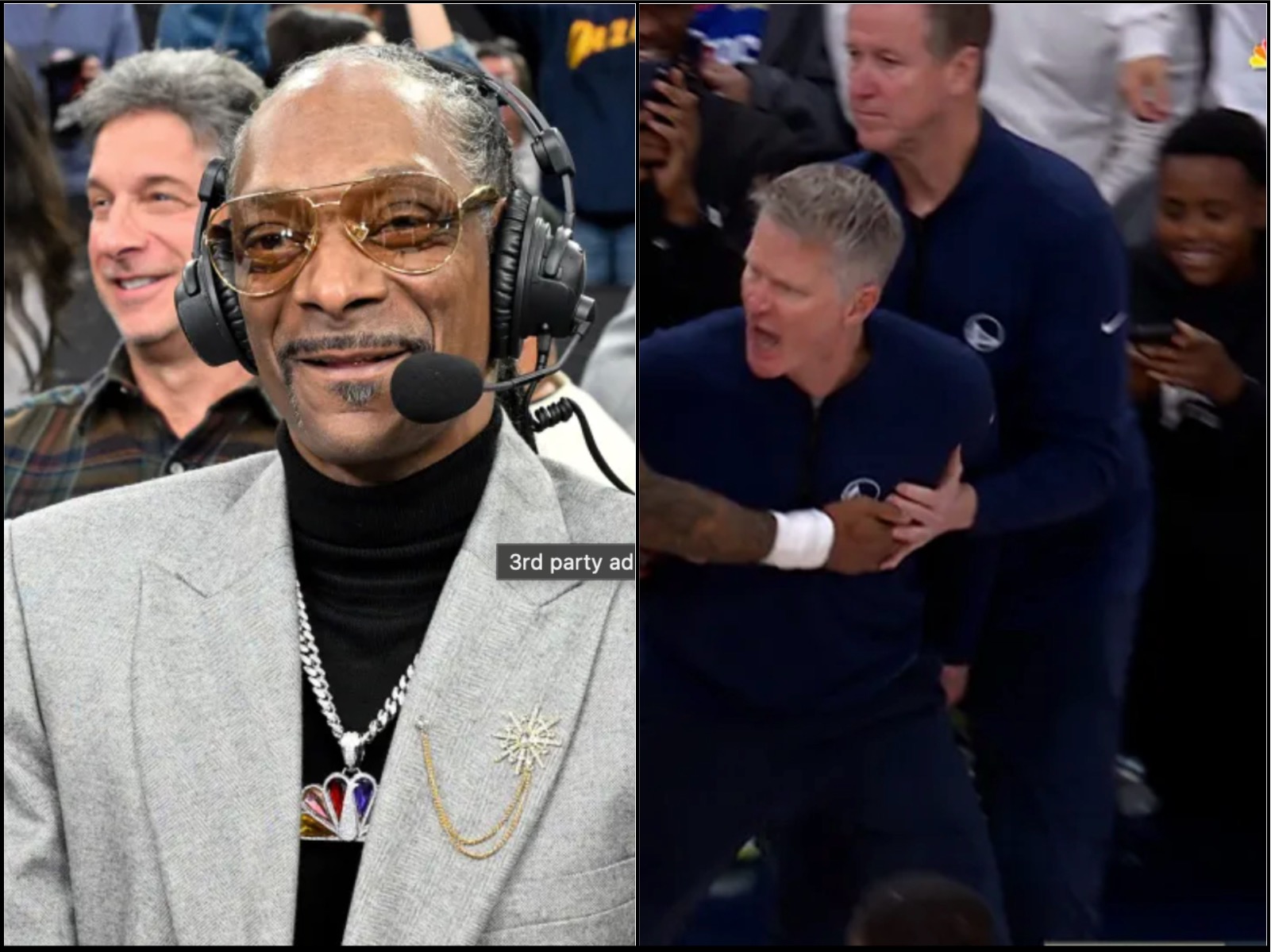 As Kerr argued his case, Snoop described the scene like a seasoned referee therapist. Every gesture got a reaction. Every step toward the tunnel felt dramatic. It was less NBA broadcast and more “uncle explaining why someone messed up at the cookout.”