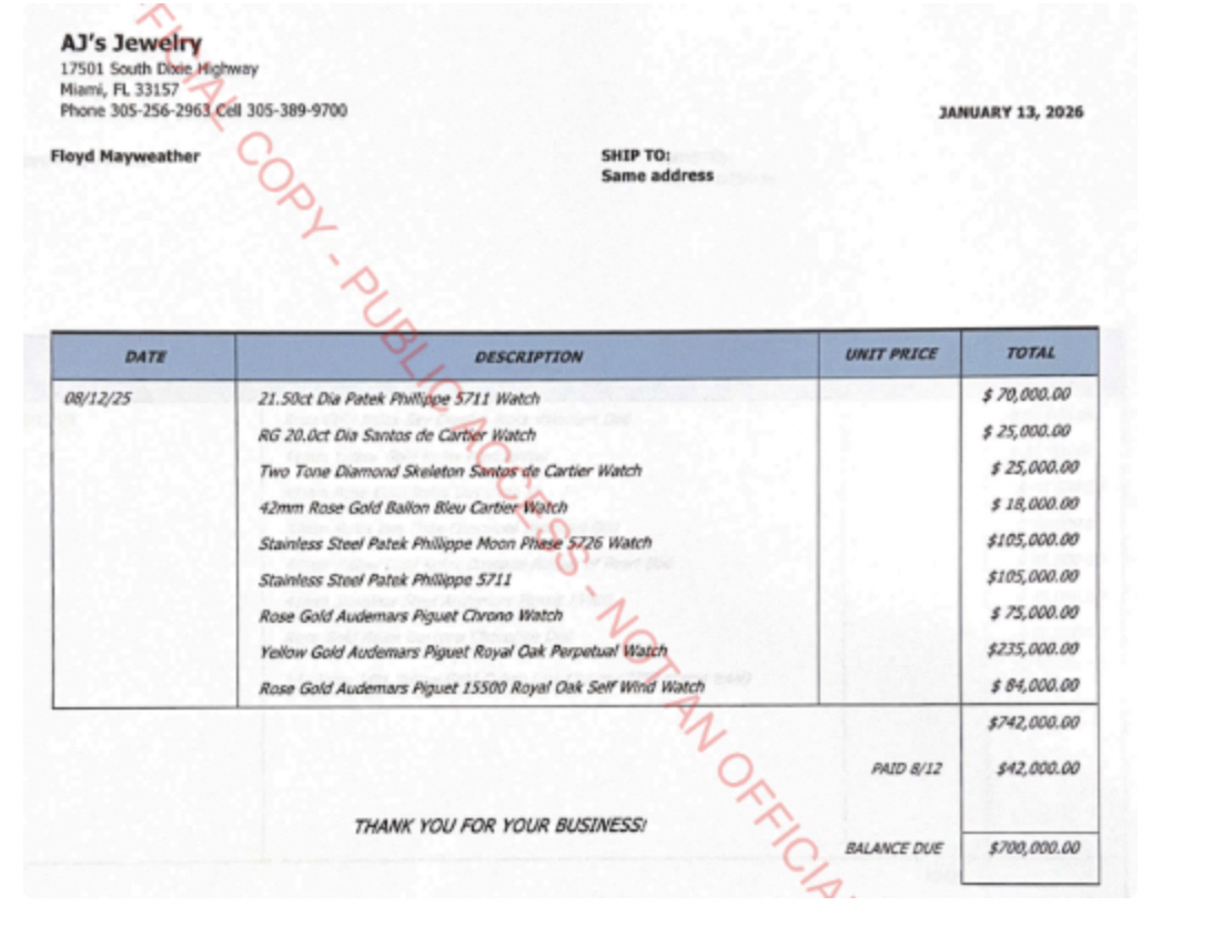 AJ’s Jewelry claims that Mayweather has paid a total of $300,000 through two separate wire transfers, one on August 21, 2025, and one on October 7, 2025. The lawsuit further alleges that Mayweather submitted five other checks between August and November that bounced. The store says it is still owed $1.375 million.